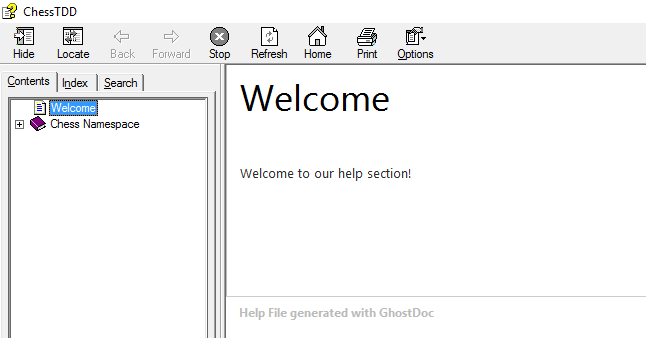 With your marked up Ghost Doc XML file, the new content file, and the new Content folder and welcome AML file, you can now re-launch Visual Studio. Open the solution and navigate through GhostDoc to generate the help documentation CHM file.