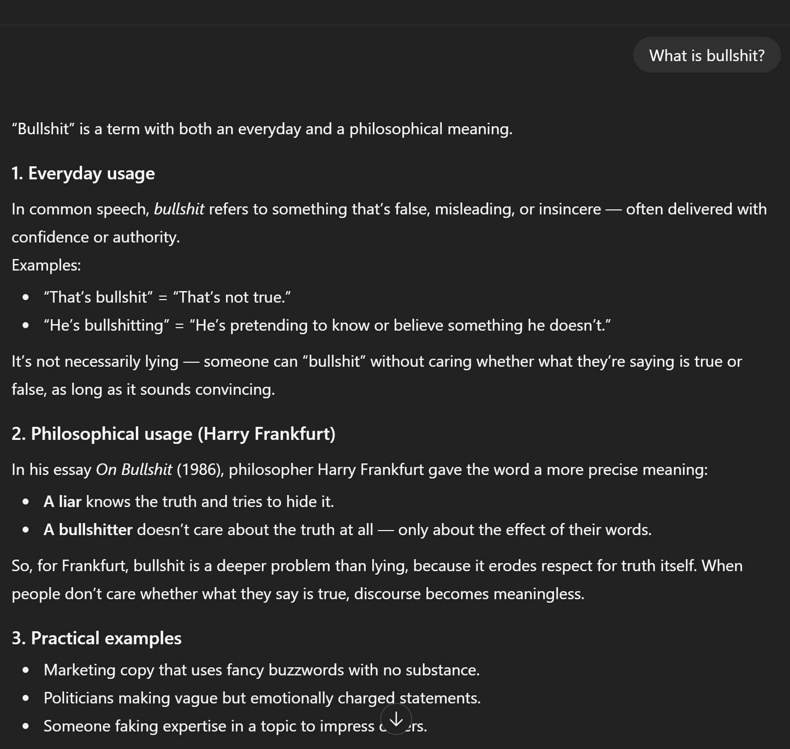 This is a particularly choice question and answer for a technology that can pass a Turing Test, but without a whiff of meaningful self-awareness. Let’s zoom in on point 2 here, Frankfurt’s explanation that “a bullshitter doesn’t care about the truth at all—only about the effect of their words.”