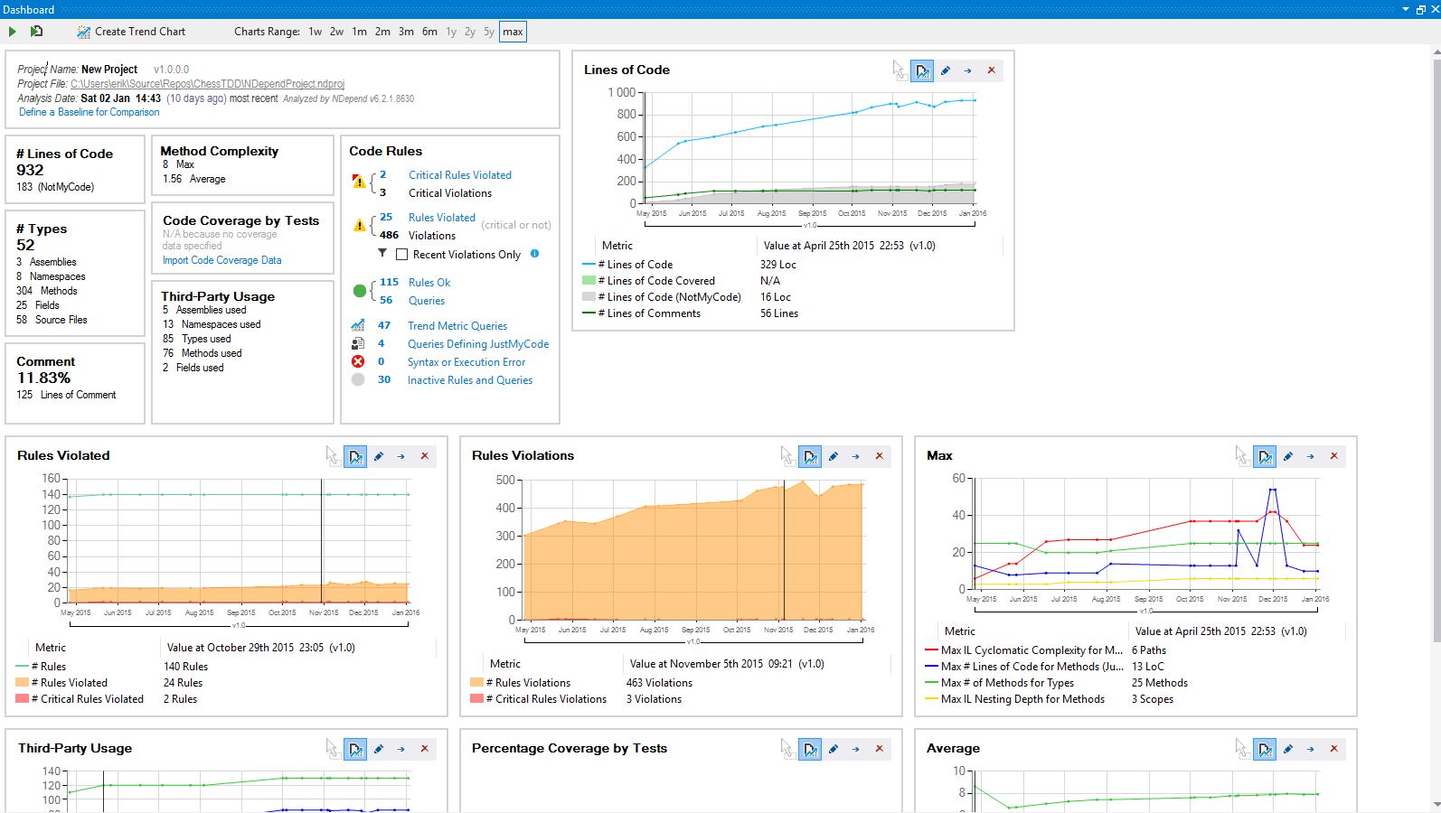 It is this musing that brings me to the NDepend dashboard.  Below is a quick screenshot of what it looks like for my ChessTDD project.